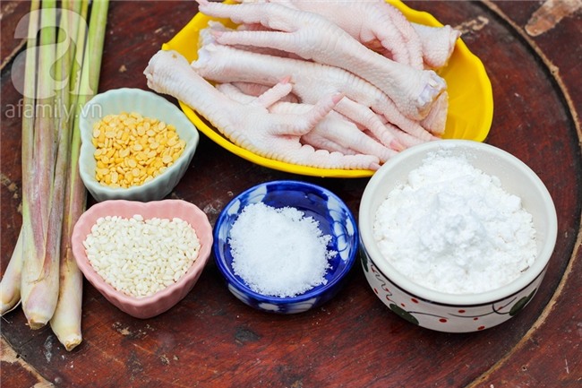 Cho chân gà vào tô lớn hoặc lòng chảo rộng, rắc muối gạo vào đảo đều, thêm sả chiên vàng vào đảo đều nữa là xong.