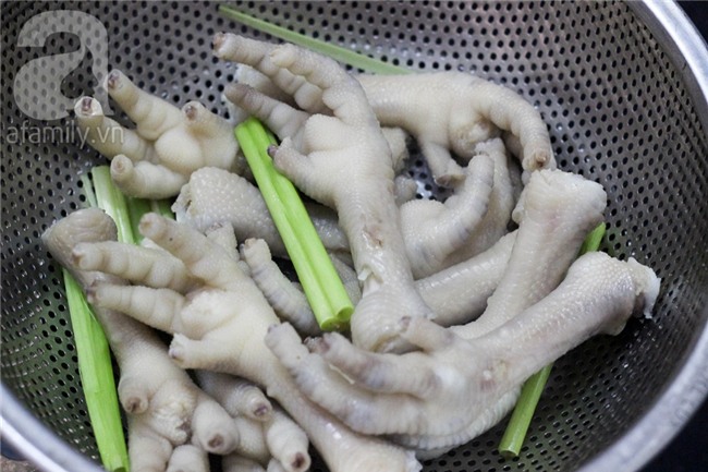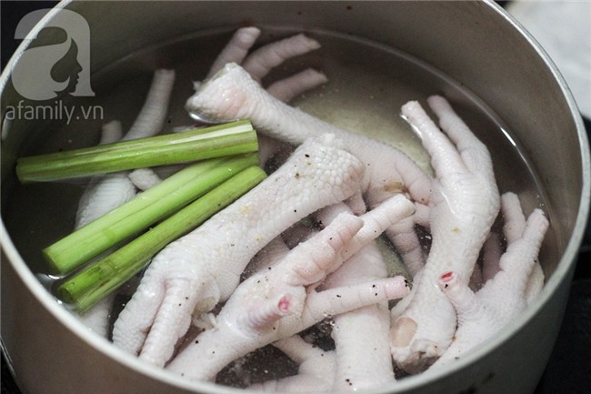 Luộc chân gà với chút gia vị và 1 cây sả đập dập đến khi chân gà vừa chín tới.