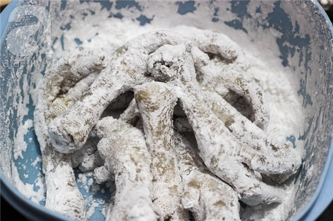 Cho chân gà vào hộp, rắc bột năng đều lên trên chân gà, đậy nắp hộp kín, lắc đều để bột năng phủ đều kín chân gà.
