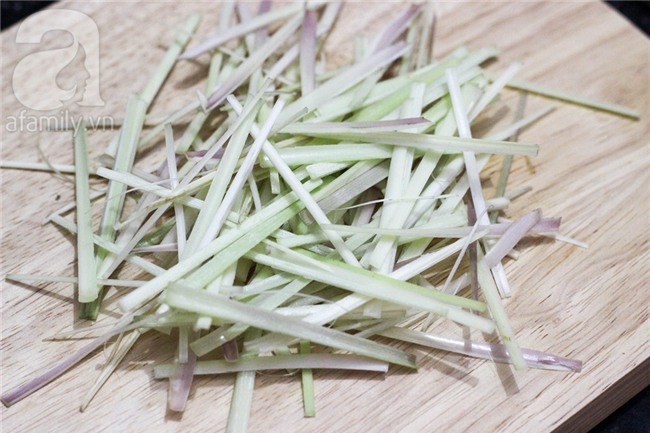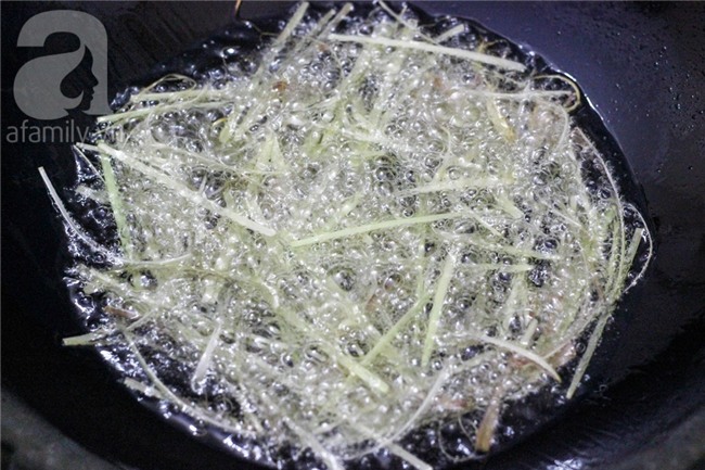 Đổ dầu ăn vào chảo, cho sả chẻ nhỏ vào chiên đến khi vàng đều.