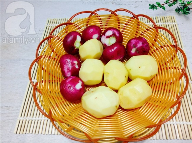 Khoai tây gọt sạch vỏ rửa sạch. Củ cải đỏ gọt bỏ phần cuống rửa sạch. Thái khoai tây và củ cải đỏ thành từng miếng nhỏ vừa gắp.