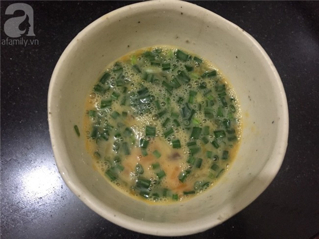 Đập trứng vào bát, thêm hành lá thái nhỏ, 1 chút xíu gia vị và bột bắp sau đó đánh tan.