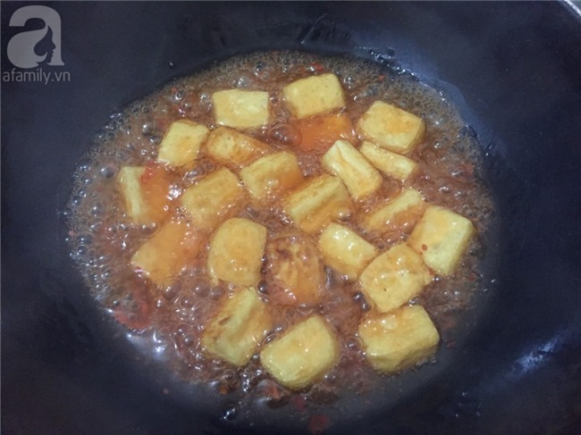 Thả đậu phụ vào, lăn đều các mặt. Đun chừng 5 phút cho đậu ngấm sốt thì nêm nếm lại gia vị cho vừa miệng rồi tắt bếp.