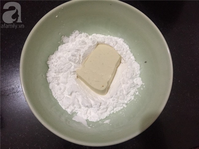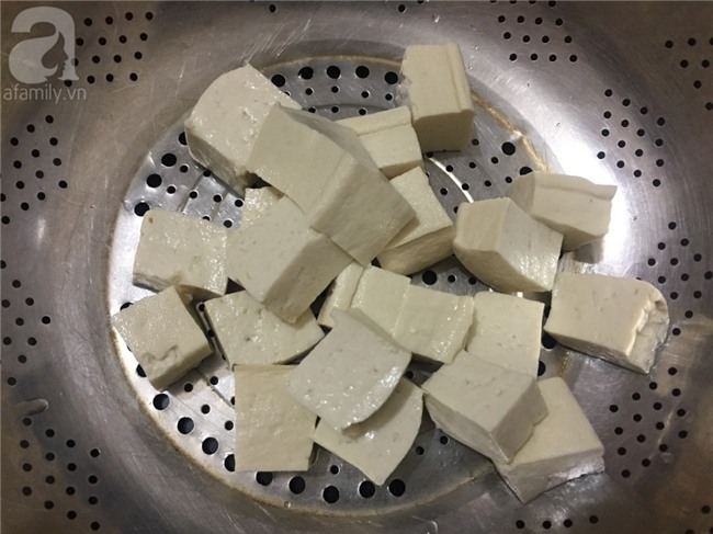 Đậu phụ thái miếng mỏng dày chừng 0,7cm. Lăn đậu phụ qua lớp bột bắp.