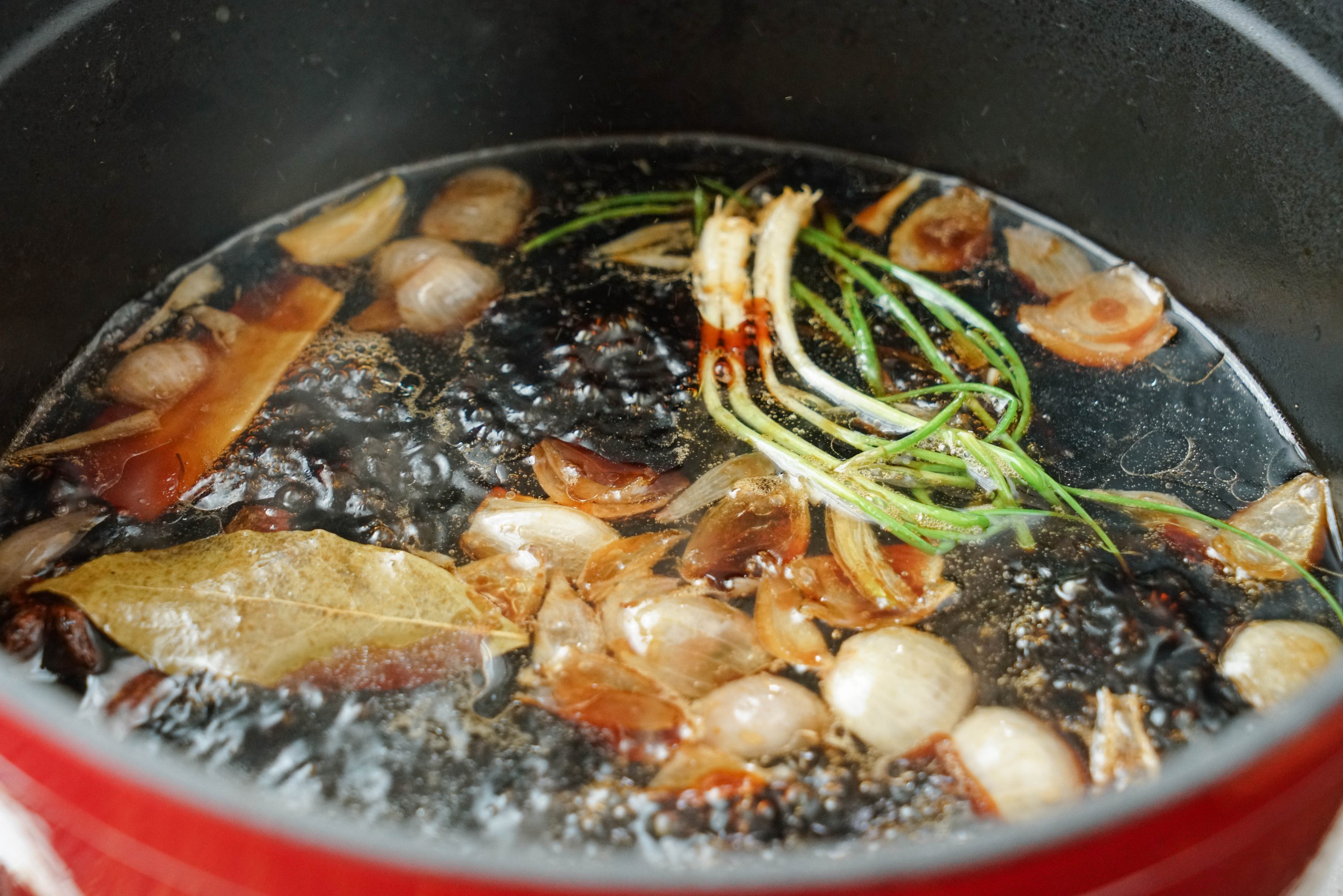 Bước 2: Sau khi da gà hơi ngả vàng thì đổ nước nóng vào cho đến khi ngập gần hết gà, thêm nước tương, nước tương đen và đường phèn vào.