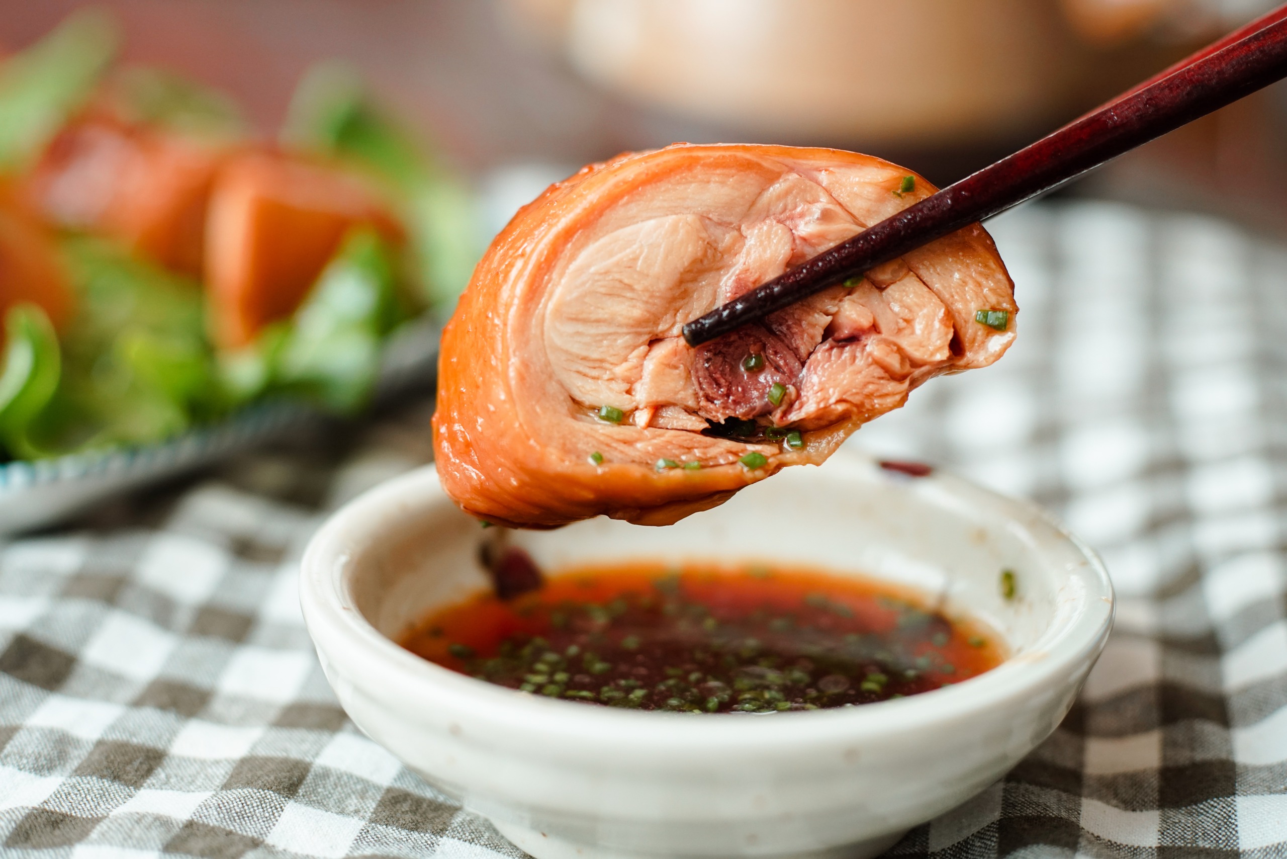Bước 3: Sau khi nước sôi, đậy nắp nồi và đun nhỏ lửa trong khoảng 25 phút. Trong thời gian này, thường xuyên lật lại và dùng đũa chọc vào chân gà, nếu không có máu chảy ra từ lỗ nhỏ thì có nghĩa là gà đã chín. Bạn lấy gà ra khỏi nồi và để nguội. Phần nước sốt bạn tiếp tục đun nhỏ lửa cho đặc lại. Khi thịt gà nguội thì bạn chặt thành từng miếng vừa ăn Cắt thịt thành từng miếng vừa ăn. Chuẩn bị 1 đĩa trang trí rau xà lách xung quanh rồi xếp thịt gà lên. Sau đó bạn rưới thêm phần sốt lên thịt gà là có thể thưởng thức.