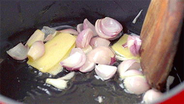 Bước 4: Chiên cho đến khi các cạnh hơi cháy thì vớt thịt bò ra và để ráo dầu. Tổng thời gian chiên bạn ước chừng khoảng 6 phút. Tiếp theo bạn đun nóng một ít dầu ăn trong chảo khác, cho hành baro băm nhỏ, tỏi và gừng băm nhỏ vào xào thơm.
