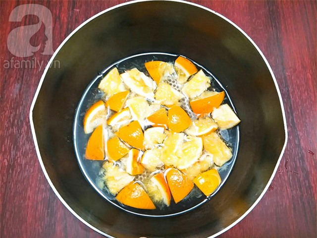 Cam rửa sạch, bổ làm đôi sau đó vắt lấy nước cốt, phần vỏ và bã cắt miếng nhỏ.