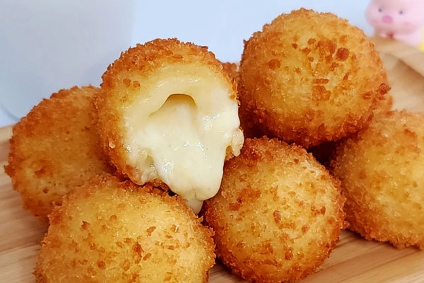 Bước 2: Lấy một lượng khoai mịn cho một viên phô mai mozzarella vào giữa rồi bọc kín lại, vê thành hình viên tròn. Phô mai nên mua cục vuông hoặc thanh dài, sau cắt thành từng viên nhỏ.