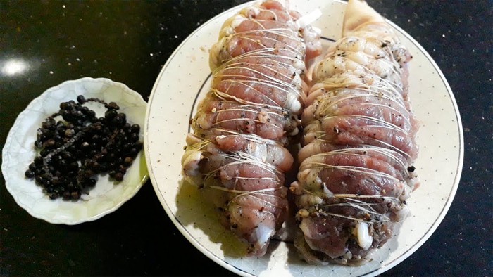 - Bước 2: Cuộn chân giò lại sao cho tròn và phần da giáp lại với nhau để thịt không bị hở ra ngoài. Cuộn xong dùng lạt bó cuộn tròn. Khi buộc lạt chỉ nên buộc vừa, không nên chặt quá vì khi luộc dễ bị nứt.