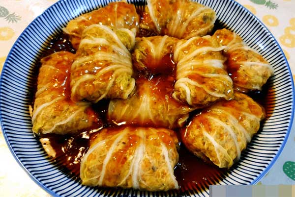 Cho rượu nấu ăn, muối, đường, xì dầu, bột tiêu trắng, gừng băm, hành lá băm và dầu mè vào thịt băm, đảo đều theo một chiều, ướp trong 10 phút. Cho nước vào nồi, đun sôi rồi cho lá cải thảo vào, chần qua rồi cho vào nước lạnh. Cho nấm hương, cà rốt vào máy xay nhuyễn rồi trộn cùng vào phần nhân thịt, đảo đều rồi để riêng. Đặt lá bắp cải lên thớt, cho thịt vào rồi cuốn lá bắp cải thật kỹ, bày ra đĩa và xếp ngay ngắn.