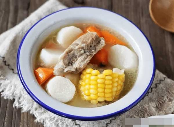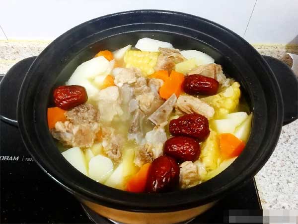 Đun sôi trên lửa lớn, vớt ngay bọt nổi, rồi vớt sườn ra, để ráo nước. Cho sườn vào nồi hầm, đổ nước nóng vừa đủ, thêm gừng thái lát và hành lá, đun lửa to, sau đó vặn lửa nhỏ hầm nửa tiếng. Hết thời gian, đổ củ mài, ngô, cà rốt miếng, táo đỏ vào nồi, tiếp tục đun nhỏ lửa trong nửa giờ. Cuối cùng nêm thêm chút muối cho vừa ăn, rắc ít hành lá cắt nhỏ lên trên lên là món ngon đã sẵn sàng.