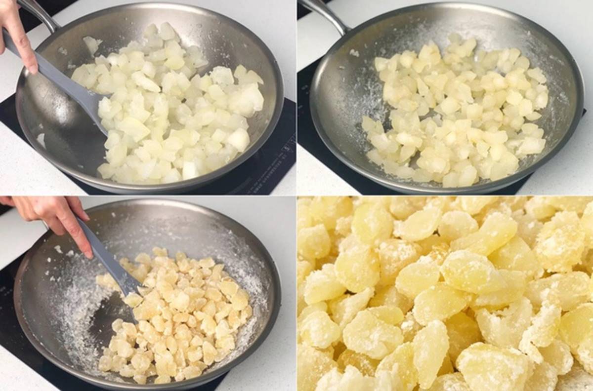 Bước 3: Đảo đều thường xuyên để mứt cùi bưởi không bị cháy. Sên ở lửa nhỏ cho đến khi đường kết tinh và chuyển thành màu trắng phủ đều từng miếng mứt cùi bưởi. Để nguội mứt rồi bảo quản mứt trong lọ kín.