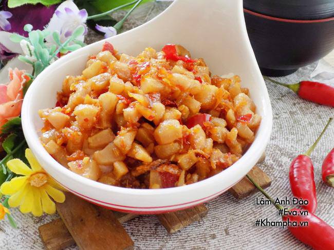 Hành thái nhỏ phi thơm rồi đổ nước mắm vào đun đến khi sệt.
