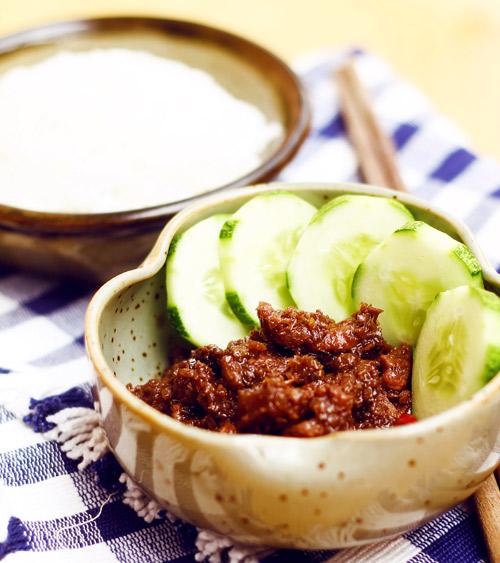 Dọn thịt xào mắm ruốc ra ăn cùng với cơm và dưa leo.