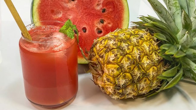 Cách làm: Bạn cắt nhỏ dưa hấu, gọt vỏ và bỏ các mắt dứa rồi cho vào máy ép là xong.