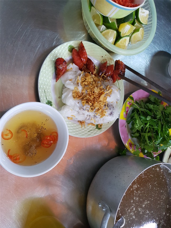 Bột làm bánh là gạo được xay ướt nên rất mịn. Sau khi đã được làm chín bởi hơi nước, lá bánh sẽ được cuốn lại với nhân thịt, mộc nhĩ và nấm hương đã được làm chín. Nước chấm ở đây được pha sẵn với chút thịt băm và nấm trong nước dùng rất lạ. Quán để trên mỗi bàn một nồi to, khi ăn bạn có thể tự múc ra bát tuỳ ý.