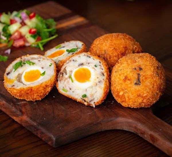 Trứng bọc thịt chiên giàu dinh dưỡng, thơm lừng là món ăn vặt từ trứng không nên bỏ qua. Trứng được bọc lớp thịt chiên xù giòn rụm bên ngoài, thích hợp thưởng thức vào những ngày se lạnh. Khi chiên, bạn nên vặn lửa nhỏ để phần thịt chín và vàng đều nhất. Nếu muốn tăng độ béo ngậy cho món ăn, luộc trứng lòng đào trước lúc rán sẽ là gợi ý tuyệt vời.