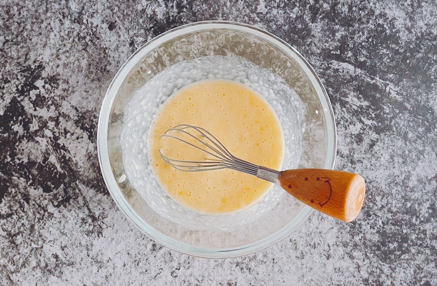 Bước 1: Chuối bóc bỏ vỏ rồi cho vào bát tô, nghiền nát. Đập trứng vào bát chuối rồi trộn đều.