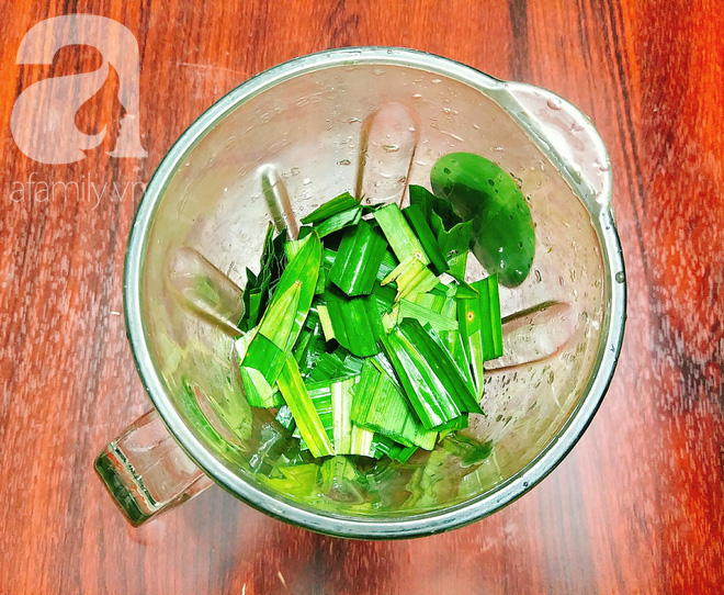 Lá dứa đem rửa sạch sẽ rồi cắt khúc ngắn cho vào máy xay sinh tố cùng với 500ml nước xay cho thật nhuyễn, đổ ra lọc lấy nước cốt lá dứa bỏ bã.