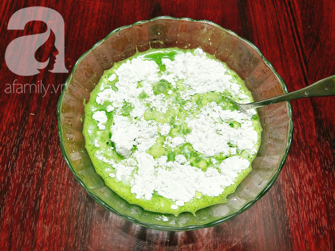 Cho nước cốt lá dứa vào tô, thêm bột gạo, bột năng, xíu muối, đường, nước cốt dừa và khuấy đều hỗn hợp cho hòa tan.