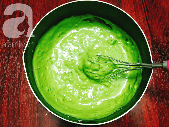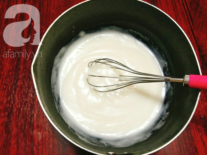 Cho hỗn hợp vừa khuấy vào nồi, bật bếp lửa nhỏ vừa và khuấy liên tục tới khi hỗn hợp đặc lại thì tắt bếp.