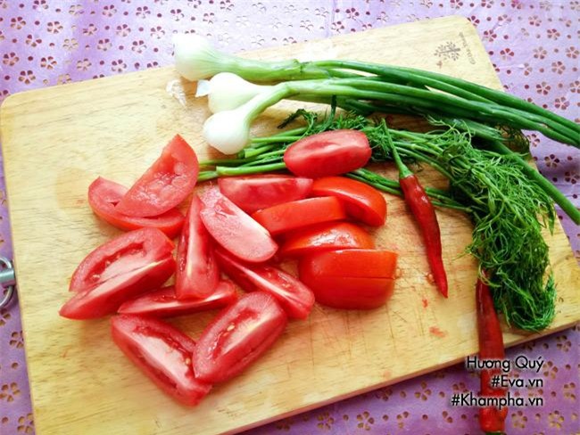 Bước 2: Cà chua rửa sạch bổ múi cau, hành, thì là, rau dăm rửa sạch, cắt khúc.