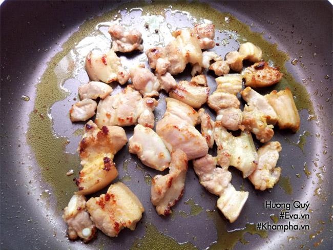 Bước 3: Thịt ba chỉ rửa sạch, thái miếng mỏng sau đó rán sơ để thịt tiết ra bớt mỡ.