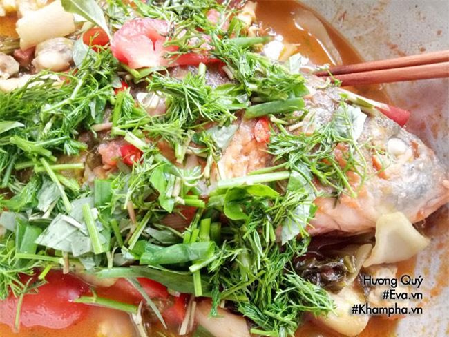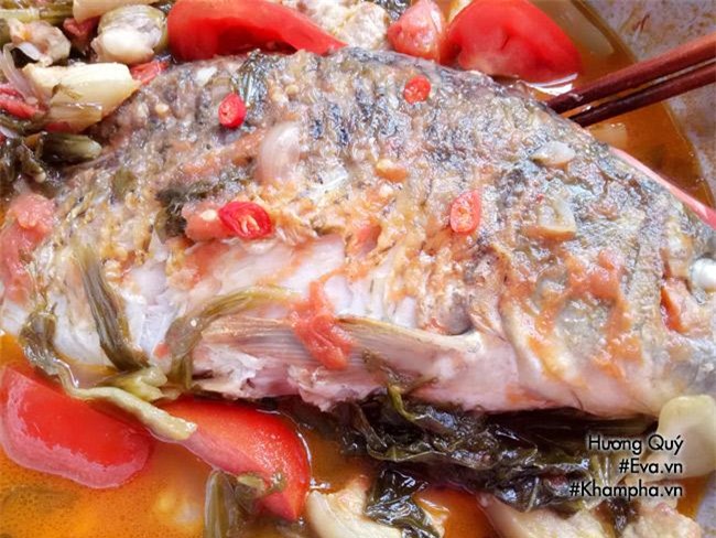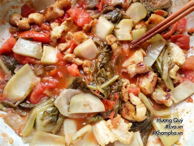 Bước 4: Thêm chút nước vào đun sôi. Sau đó thả cá đã chiên vàng vào đun nhỏ lửa, tiếp đến cho thịt heo vào. Nêm nếm gia vị cho vừa miệng. Khi thấy cá gần chín thêm dưa chua vào đun cùng. Khi thấy phần nước cạn bạn có thể tra thêm nước nhưng nhớ là phải nước sôi để cá không bị tanh.