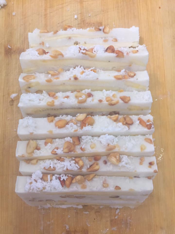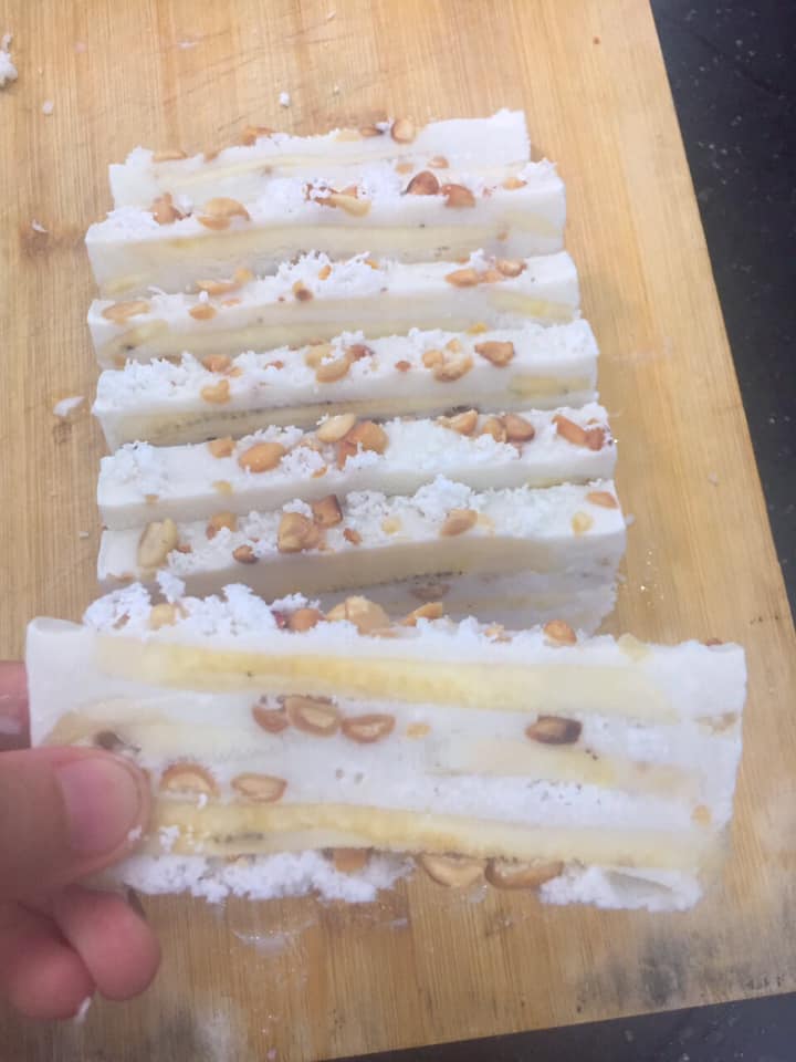 - Chuẩn bị các hộp: cho vào hộp thứ tự lớp đậu phộng rang, dừa nạo, chuối, hỗn hợp sữa, rồi lại đậu, dừa, chuối, sữa... cứ lặp lại như vậy đến khi đầy hộp.