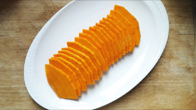 Bạn gọt vỏ bí đỏ, bỏ phần xơ hạt. Rửa sạch rồi thái vát thành miếng mỏng.
