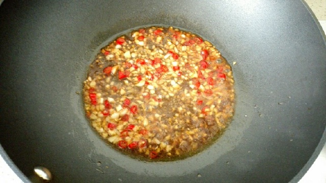 Trong khi đợi hấp bí đỏ, bạn cho vào chảo 1-2 thìa cà phê dầu ăn và phi thơm phần tỏi, ớt đã băm nhỏ. Khi tỏi ớt dậy mùi thơm, thêm vào chảo 2 thìa canh nước tương, 2 thìa canh nước lọc, 1 thìa cà phê dầu mè. Đun cho đến khi hỗn hợp sôi lăn tăn thì tắt bếp.