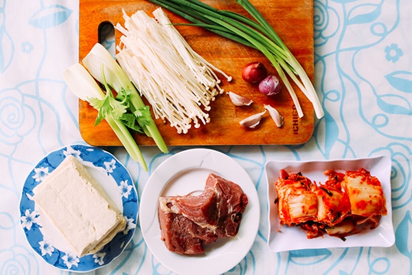 - Kim chi: 200gr - Nấm kim châm: 200gr - Hành boaro - Thịt bò: 200gr - Đậu phụ non: 2 miếng |