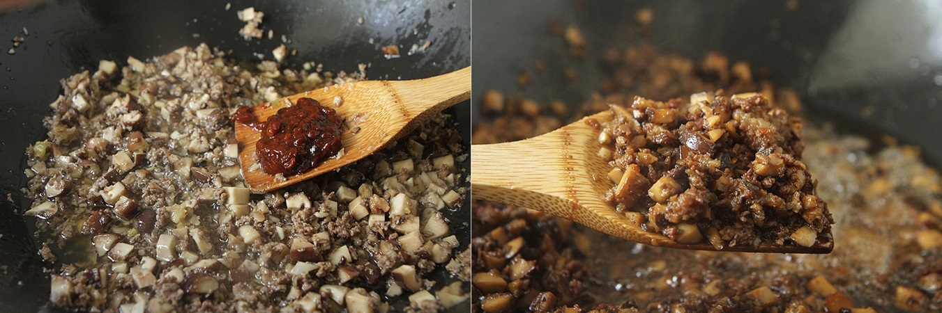 Thịt bò rửa sạch rồi dùng giấy bếp thấm cho khô. Băm nhỏ thịt bò. Nấm hương khô ngâm mềm, nấm hương tươi rửa sạch sau đó thái thành khối nhỏ. Tỏi, gốc hành, gừng băm nhỏ.