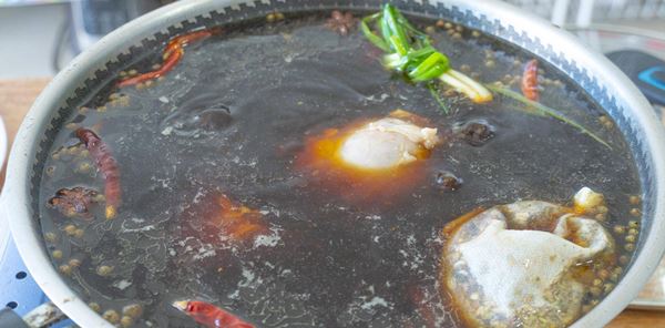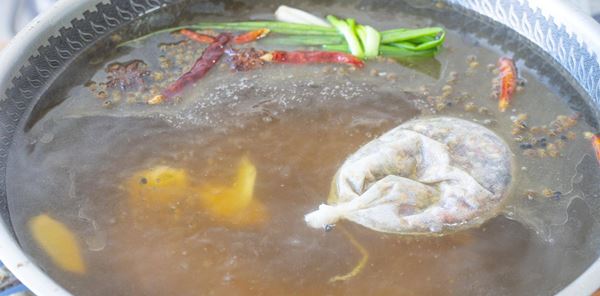 4. Tiếp tục đổ nước sôi vào, cho hành lá, gừng thái sợi, xì dầu, muối, gói hương vị.