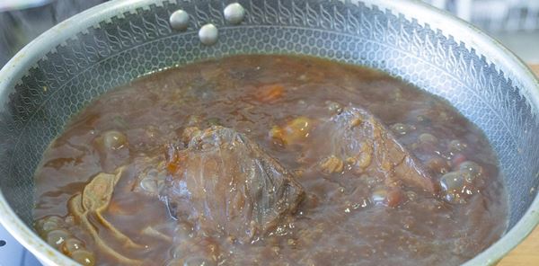 6. Cho thịt bò vào, đun ở lửa vừa và nhỏ trong 1,5 giờ, sau đó chuyển sang lửa nhỏ và đun trong nửa giờ. Nếu dùng nồi áp suất thì khoảng 45 phút là đủ.