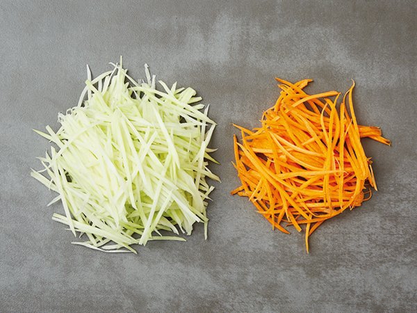 Bước 1: Đu đủ, cà rốt gọt vỏ rửa sạch. Sau đó bào đu đủ và cà rốt thành sợi mỏng.