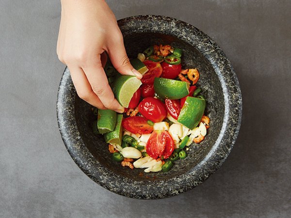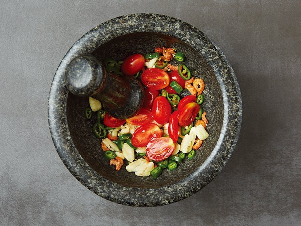 Bước 3: Cho ớt thái nhỏ vào cối, thêm tỏi, tôm khô vào rồi giã dập. Tiếp đó cho cà chua bi đã bổ đôi vào giã qua.