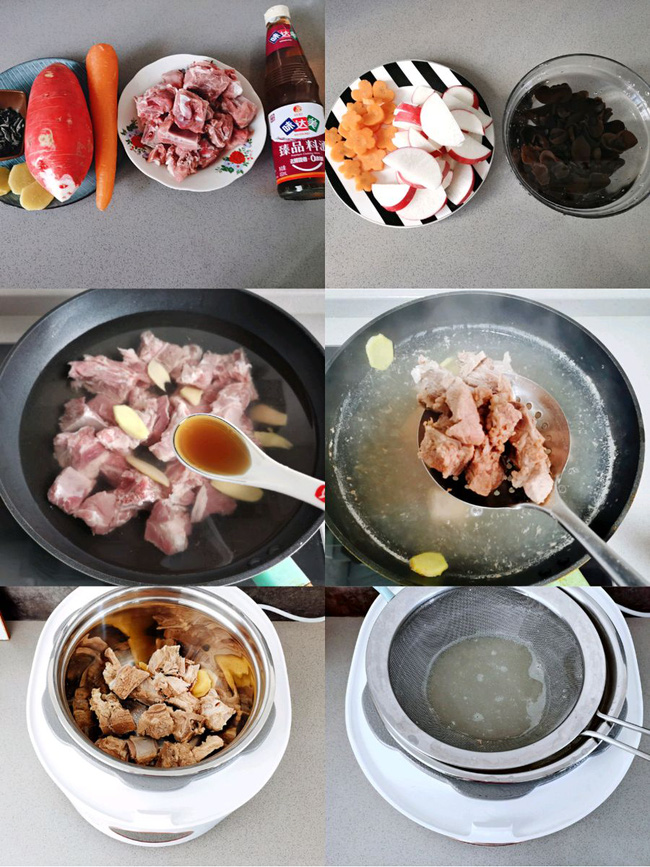 Đầu tiên, bạn rửa sạch củ cải để nguyên vỏ hoặc gọt bỏ vỏ. Sau đó thái miếng mỏng. Mộc nhĩ ngâm nước cho nở, sau đó rửa lại thật sạch. Cà rốt gọt vỏ, thái miếng. Cho sườn đã rửa sạch vào nồi cùng với gừng thái lát và 1 thìa súp rượu nấu ăn, đổ nước ngập sườn. Đun sôi, thì vớt sườn ra sửa sạch. Phần nước luộc sườn lọc qua rây loại bỏ cặn. Cho sườn vào nồi hầm, hoặc nồi áp suất sau đó đổ phần nước luộc sườn lúc nãy vào. Nêm chút gia vị vào ninh.
