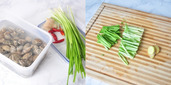 Chuẩn bị các nguyên liệu. Ngao ngâm nước muối trước 1-2 tiếng để nhả hết cát, sau đó bạn rửa thật sạch. Hẹ rửa sạch, cắt khúc dài từ 3-4cm. Gừng thái lát mỏng.