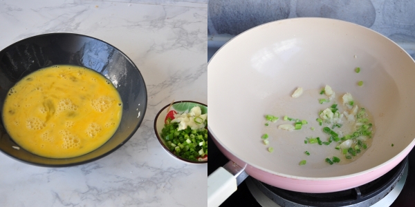 Tỏi băm nhỏ, hành thái nhỏ. Đập trứng vào bát sau đó thêm chút gia vị và đánh đều cho tan. Cho chút dầu vào chảo, thêm 1 xíu đầu hành trắng vào đảo cùng cho thơm.