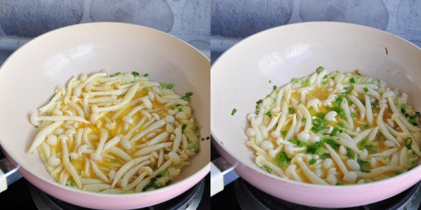 Tiếp theo cho nấm vào xào khoảng 3 phút thì đổ trứng vào. Chiên nhỏ lửa để trứng và nấm chín. Sau đó rắc nốt chút hành còn lại. lật mặt trứng để 2 mặt chín đều.