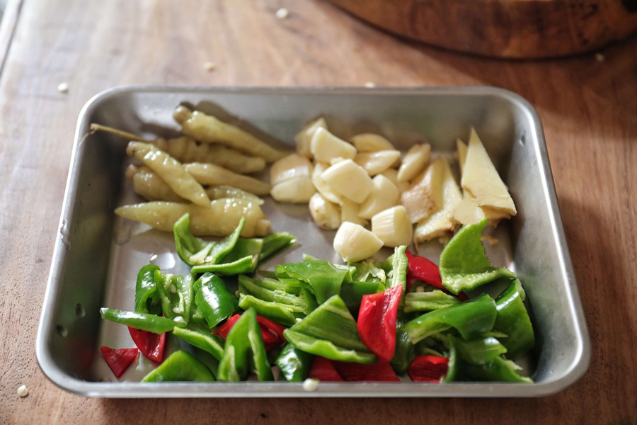 Bước 2: Ớt xanh và ớt đỏ thái miếng, tỏi gừng thái lát.
