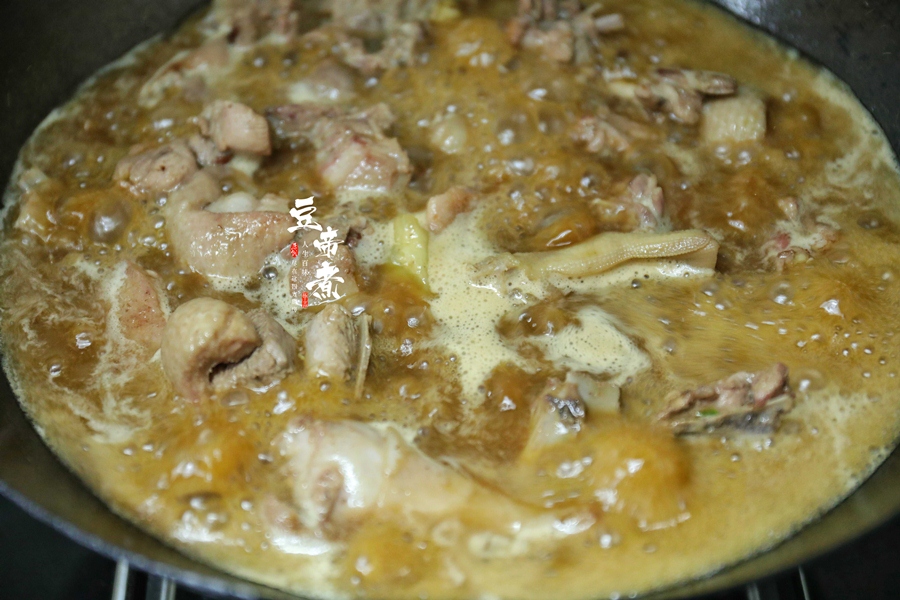 Bước 4: Đổ nước tương vào đảo đều, sau đó thêm lượng nước thích hợp và phần gia vị cùng ớt ngâm vào nấu chung. Đun sôi ở lửa lớn sau đó hạ nhỏ lửa đun cho đến khi nước cạn gần hết và thịt vịt chín mềm.