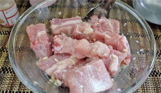 Sườn mua về rửa sạch, để ráo sau đó cho vào tô ướp cùng với hành tím băm, tỏi băm, nước mắm, đường, muối trong ít nhất 1 giờ đồng hồ hoặc qua đêm.
