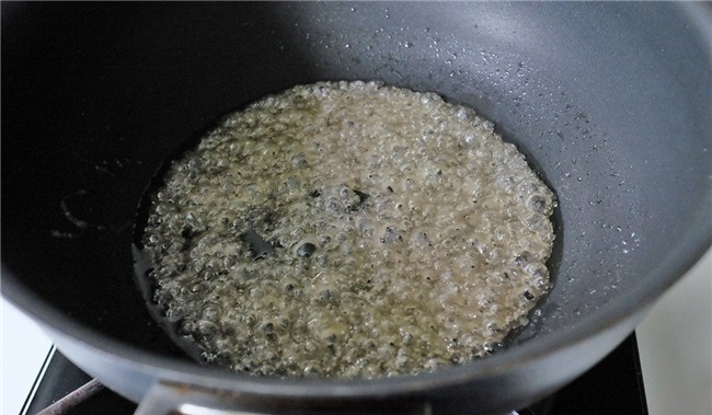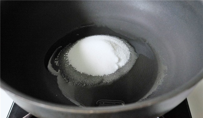 Bắc chảo lên bếp ở lửa nhỏ sau đó cho đường và 60ml nước vào đun.