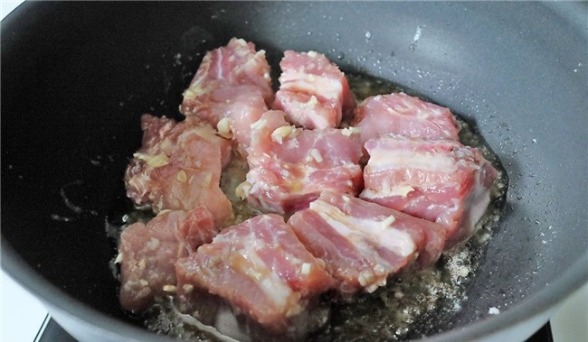 Lúc này cho sườn và 1 muỗng canh nước mắm vào, đảo đều tay.
