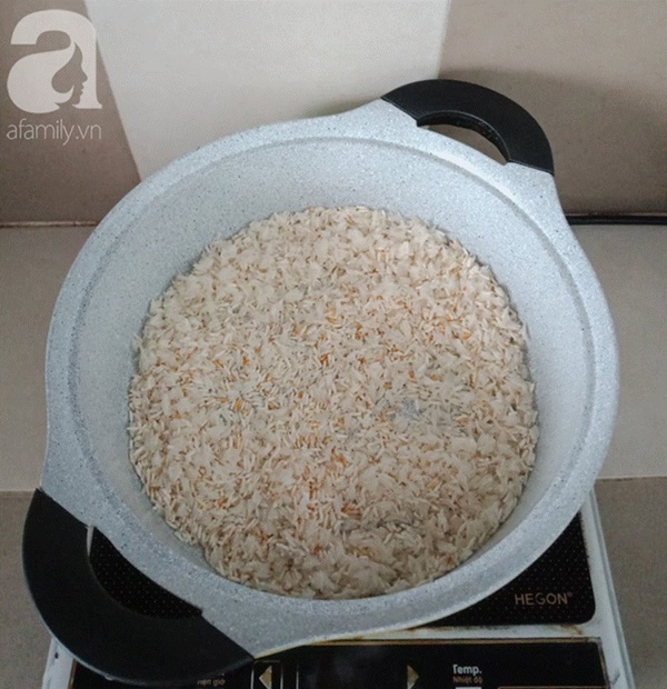 2. Trộn lẫn gạo nếp và gạo tẻ, vo sạch, chắt ráo nước rồi cho vào nồi rang cho thơm và sém vàng. Đổ ra dĩa.