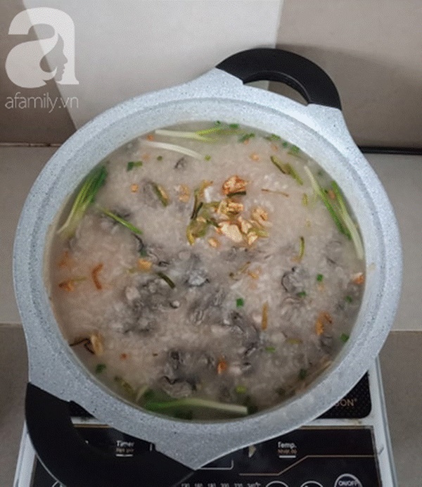 Khi cháo chín nhừ rồi thì đổ hàu đã xào vào, nêm ít muối, bột ngọt, nếm cho vừa miệng là được. Cho đầu hành còn lại, ít tỏi hành phi và khuấy nhẹ. Tắt lửa.
