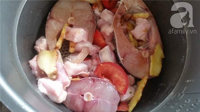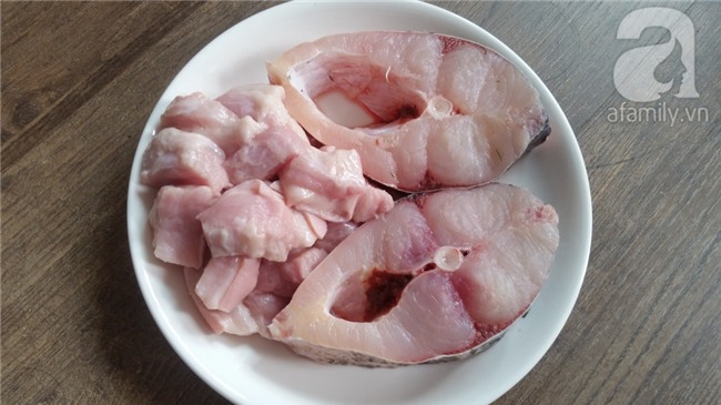 Cá mua về rửa sạch, để ráo nước rồi tẩm ướp cùng chút gia vị để ngấm 15 phút. Thịt ba chỉ rửa sạch, thái miếng vuông.